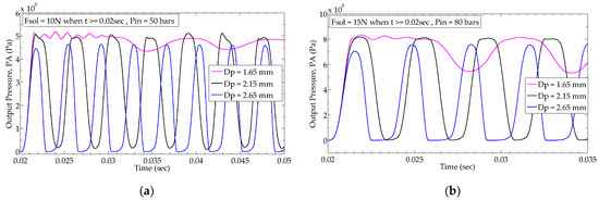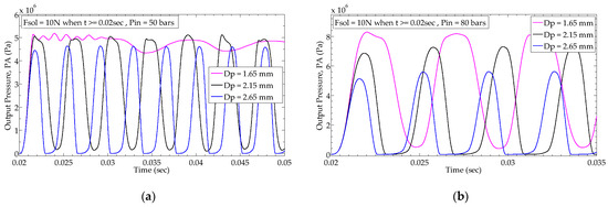 Considering the case of Dp = 1.65 mm, Table 4 shows that for 10 and 15 N, the suitable pressure settings are 50 and 80 bar, respectively. If the inlet pressure is set close to the suitable pressure (as is done for the cases of Figure 7a,b), the fluctuations are less profound and similar to each other, shown by the magenta colored line in Figure 7. However, if the inlet pressure is increased to 80 bar for 10 N when only 50 bar is sufficient, the output pressure starts to deviate more significantly, and variations are more profound without being able to die down as time proceeds.