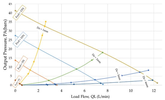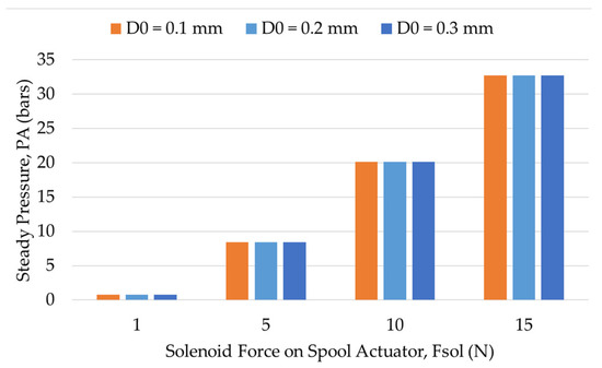 For a pressure-reducing valve, the inlet pressure should be greater than the intended steady-state pressure at the outlet. The pin diameter influences the range of steady-state output pressure for a specific range of solenoid force. Under a no-load flow condition, if the range of force exerted by the solenoid actuator is fixed, i.e., 0 or 15 N, as considered in this study, the pressure range can be derived from Equation (10), as shown in Equation (19).