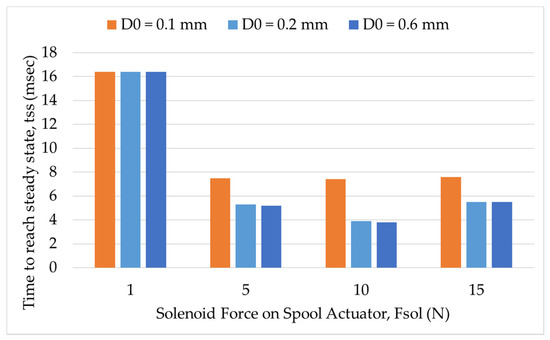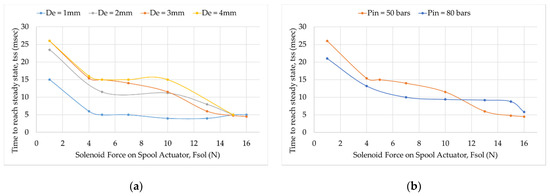 Knowing about the impact of pin diameter and analyzing the subsequent results are necessary when designing a valve for an application such as variable displacement pumps. Furthermore, the resulting fluctuations in the valve outlet pressure will result in increased noise and reduced reliability of the pump, as well as inaccuracies in the pumps outlet pressure or flow rate due to hydraulic shocks, examples of which can be seen in [30,31,32,33]. For any particular application, the effect of pin diameter is to be carefully considered, especially for a no-load flow condition. The valve should be able to handle the inlet pressure changes even after being subjected to a drastic change in the actuating force.