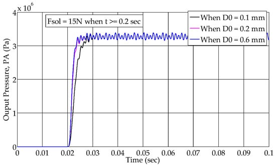 The Simulink model was run for different values of pin diameter and inlet pressure without violating the criteria shown in Table 4. The output pressure is plotted with time, as shown in Figure 7 and Figure 8.