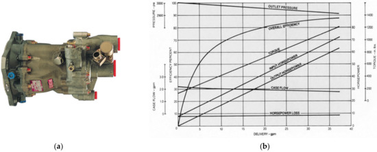 Figure 2. Engine driven pump of the Airbus A320 (from Eaton flyer): (a) A320 engine-driven pump; (b) typical steady-state power capability.