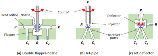 Figure 4. Hydraulic amplifiers used as pilot stages for servovalves: (a) Double flapper-nozzle; (b) Jet pipe; (c) Jet deflector.