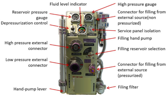The hydraulic fluid must typically perform its energy carrying function for several 10 thousands of hours. Therefore, it must be present in sufficient quantity, and sufficiently free of solid/gaseous/foreign liquid pollution. Solid pollution is really a concern, especially for servovalves, which require clearances of a few micrometers between their moving parts to meet the performance requirements. The hydraulic fluid must also be kept within a defined temperature range so as not to become degraded and not to reduce the mechanical and volumetric efficiencies too much at low and high temperatures, respectively. During aircraft assembly, as well as for maintenance, fluid conditioning requires special skills, rigorous, safe practices, and dedicated on-board hydraulic equipment (see Figure 5) for bleeding, filtering, periodic checks, monitoring and reservoir filling. It is also worth mentioning that the fluid toxicity imposes a hard constraint on designers for the routing of the hydraulic networks, e.g., because no hydraulic circuit is generally allowed in a pressurized area of a commercial aircraft. This is to avoid spraying in case of leakage.