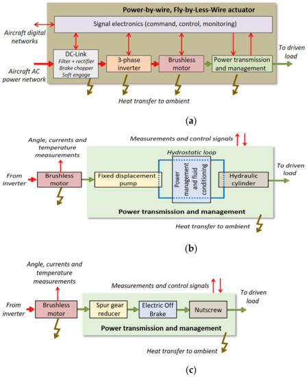 Figure 6. Architectures of power-by-wire actuators: (a) Generic architecture with focus on power flows; (b) Power transmission and management in EHAs; (c) Example of power transmission and management in EMAs.