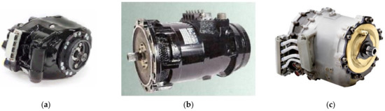 Figure 8. Evolution of main AC generators for commercial aircraft (images from Hamilton Sundstrand flyers): (a) Airbus A330 115 kVA IDG; (b) Airbus A380 150 kVA VFG; (c) Boeing B-787 250 KVA VFSG.
