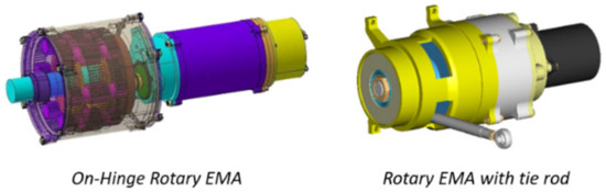 There is also a need to reconsider the integration of the actuators within the airframe. For EMAs, it seems illogical to use an intermediate linear motion to transmit mechanical power from a rotating motor to a rotating load: simply replacing conventional actuators by PbW ones is not the ultimate best option. There is thus a need to re-consider the actuator/airframe/driven load integration. There are many options, which still need to be maturated: new concepts for distributed actuation [40] or wing morphing [41], new actuation architectures to transmit (or react to) the actuation loads e.g., using on-hinge or tie-rod Geared Rotary Actuators (GRAs), Figure 21.