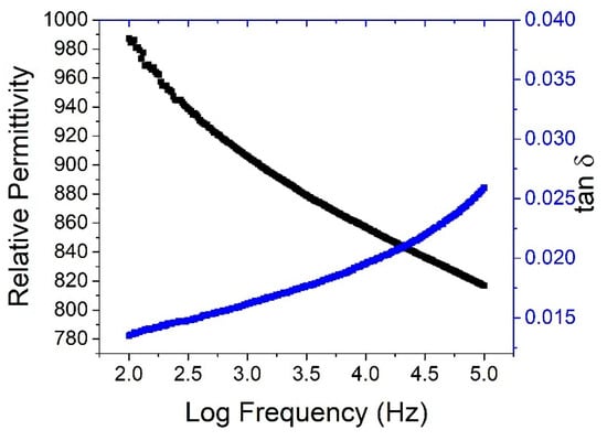 The top and bottom faces of the sample in the orientation shown in Figure 3c were electroded by sputter depositing gold. The dielectric permittivity and loss tangents were measured using a Hewlett-Packard 4284A LCR meter (Agilent Technologies, Inc., Palo Alto, CA, USA). A system with a Trek Model 30/20 high voltage amplifier system (Trek, Inc., Lockport, NY, USA) and LabVIEW software (National Instruments Corporation, Austin, TX, USA) were used to measure the polarization-electric field hysteresis loops (P-E loops) at room temperature at a frequency at 10 Hz. The samples were DC poled at 70 °C at 2 times the coercive field (35 kV/cm [66]) for 1 h in the direction shown by the black arrow in Figure 3c.