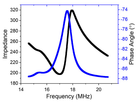 Typical coupling coefficient k33 values for a hard doped PZT are 0.64–0.7 (* Manufacturer reported values (https://www.bostonpiezooptics.com/ceramic-materials-pzt accessed on 18 August 2021)). As shown in Figure 8, the resonance and antiresonance frequencies obtained were 17.01 and 17.94 MHz, respectively. The coefficient kt was derived from these resonance () and antiresonance () frequencies using the following Equation [20]: