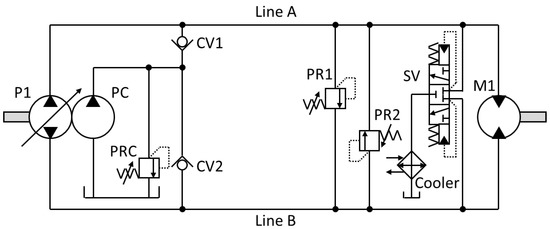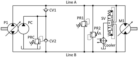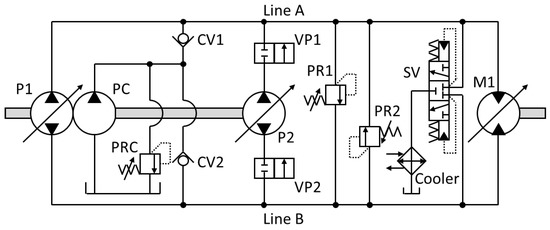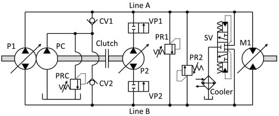 The basic schematic of a closed-circuit HT is shown in Figure 1. Typically, one variable displacement hydraulic unit (pump, or primary unit) is mechanically connected to the prime mover (i.e., the combustion engine) and exchanges hydraulic energy with one or more hydraulic units (motor or secondary unit) connected to the wheel axle(s). The secondary unit can be either a fixed or variable displacement. As shown in Figure 1, usually the HT includes a shuttle valve (SV) for oil cooling (Cooler), a cross port pressure relief valve (PR1&2) for protection from pressure overload and a charge circuit (PC, CV1, CV2, PRC) for oil replenishment. Different variants to the basic architecture of Figure 1 exist, as pertains to the charge circuit, the connections of multiple motors, in either series or parallel configurations, and on the flushing circuit. Significant examples can be found in [2,3,4,5].