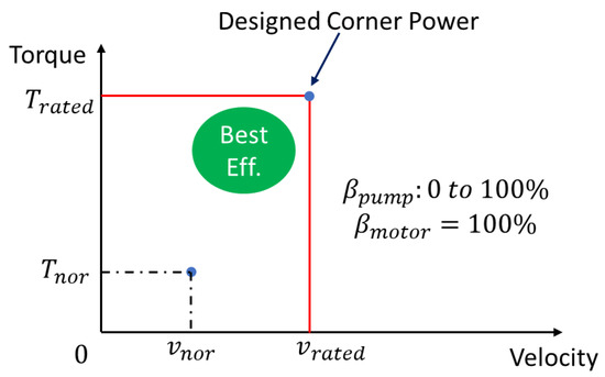 For the type of vehicle considered in this study, the typical HT follows a schematic such as the one of Figure 1, which includes one variable displacement hydraulic pump and one fixed displacement motor. This schematic will be considered as baseline reference. Figure 2 shows the operation condition for the reference HT system. The upper-right blue dot is the designed corner power condition with respect to machine rated maximum speed and rated maximum load torque .