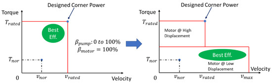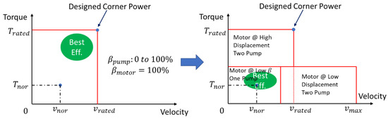 With the assumption that the total displacement of P1 and P2 in Solution A is the same as the displacement of P1 in the reference machine and the motor is the same size as the reference machine as well, the effect on the HT operating range given by Solution A with respect to the reference system of Figure 1 is shown in Figure 4. The left plot of Figure 4 shows the working range of the reference HT system with the designed corner power (rated maximum vehicle speed and load). By adding P2 and a two-position motor, Solution A enlarges the range of operating velocities and will also be able to achieve the corner power condition. The enlarged velocity range is because the motor could lower its displacement, so the machine potentially can travel at higher speed than the rated speed as shown in Figure 4 right. Most importantly, for the most frequent operating condition, the transmission can operate at its best efficiency, as shown in Figure 4 on the right.