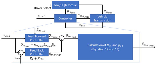 First, the operator will choose if the machine needs to be in high or low torque mode. This alone will determine the motor position : either low displacement for the most frequent operating mode or maximum displacement for high torque mode. Then, the controller takes the motor position information and the requested speed to calculate the two pump displacements . A feed-forward and a feedback controller are used to precisely control the vehicle speed. The feed-forward controller calculates the theoretical flow rate needed from the pump to achieve the requested vehicle speed. The feedback controller is a proportional–integral (PI) controller to monitor and correct any speed error by providing makeup flow for volumetric loss of the pump and motors. Both flows will be added together as the total flow required to calculate the displacement of P1 and P2. If the total flow required is lower than the maximum flow of pump P1 , then the P1 displacement will be calculated and P2 will remain at zero displacement and become isolated from the system (close VP1, VP2 and open the clutch for Solution A) to reduce the loss as in Equations (12) and (13) condition. If the total flow required is higher than maximum flow of P1, then P1 is held at maximum displacement and P2 will engage (open VP1, VP2 and close the clutch for Solution A) to provide flow in addition to the flow P1 already provides as in Equations (12) and (13) condition.
