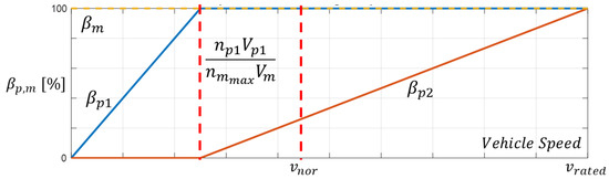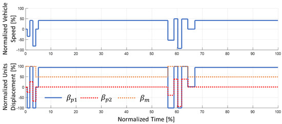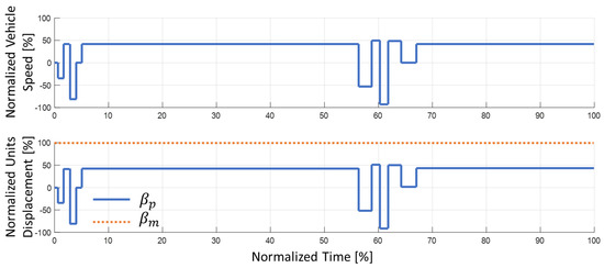 For the most frequent operating conditions, it is convenient to have P1 providing flow near its maximum displacement, while P2 is isolated by means of the clutch and the on/off valves. In this condition, the hydraulic motor operates at the low displacement setting. Figure 9 shows the displacement change vs. vehicle speed for near the most frequent operating condition mode. At standstill, P1 is at zero displacement. When a higher speed is requested, only P1 increases the displacement. When the P1 reaches its maximum displacement, the vehicle is slightly faster than the most frequent operating condition vehicle speed (50% vehicle speed). Vehicle deceleration occurs with a similar, but reversed, procedure.
