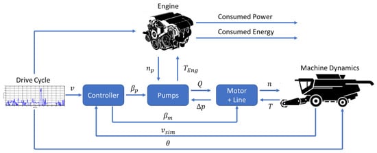 Although the optimization algorithm considered that the pump and motors are working under stationary operating condition, near constant speed and load, a dynamic simulation model was developed within this research for more realistic predictions. Even if the drive cycle of an agricultural machine such as a harvester operates mostly near a fixed point, during a real drive cycle the HT may also encounter points different from the one assumed in the optimization. For this reason, this paper also considers a realistic simulation of a specific harvester operating on a given drive cycle as opposed to the constant operating point used during the optimization process. Therefore, the optimized sizing for each HT configuration is evaluated by simulating a real drive cycle of a harvester with varying engine speed, ground speed and instant system pressure. In this way, the model can highlight the actual operation of the system and quantify the energy savings.