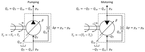 Losses in the hydraulic primary or secondary unit are the volumetric loss and the torque loss [7], which are often expressed in terms of volumetric efficiency, representative of the flow loss , and hydromechanical efficiency, representative of the torque loss . These losses can be expressed as a function of the working conditions:
