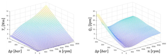 The theoretical flow rate and torque of the hydraulic unit (pump and motors) are represented by Equations (19) and (20). For a realistic calculation, the volumetric loss and the hydromechanical loss must be considered. In this work, the unit loss look-up table is used to accurately model the pumps and motors (Figure 12), as described in the previous Section 2. The effective flow rate ( and torque are computed using Equations (21) and (22). is the unit external and internal leakage flow.