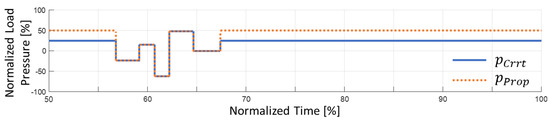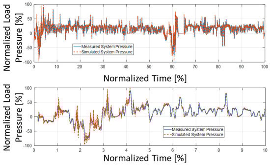 The pressure build-up Equations (27) and (28) is used to determine the pressure dynamic in line A and line B as a lumped system. This equation is derived from conservation of mass and the constitutive equation for the oil, assuming isothermal conditions [4]. The pressure is directly related to the integration of total flow coming into and out of the control volume and the volume changes . Furthermore, the pressure is proportional to the control volume’s hydraulic capacitance , which include the control volume and bulk modulus . The control volume is calculated based on the hydraulic line inner diameter and the line length. The bulk modulus is chosen based on the oil used in the reference machine and the normal operating temperature.