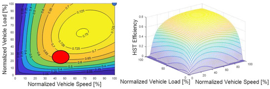 With the above equations related to the HT performance, the whole working range of the vehicle is mapped directly to the pump and motor working conditions uniquely. Then, the pump and motor volumetric and hydromechanical efficiency is calculated through Equations (7)–(10). Finally, the whole HT system efficiency is simply the product of all pump and motor volumetric and hydromechanical efficiency as shown in Equation (11).