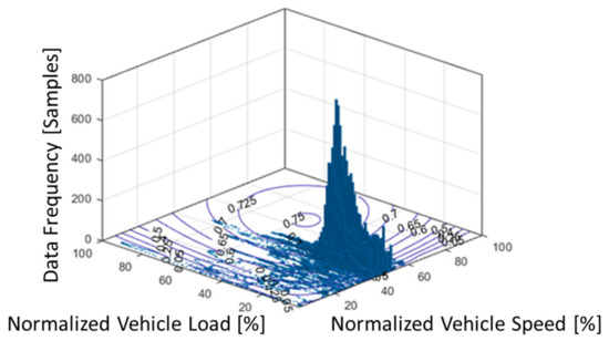 The objective function is key for any genetic algorithm. In this work, the objective is to maximize the overall system efficiency which is defined using Equation (11). As discussed earlier this transmission system efficiency is heavily dependent on the displacement settings of both the hydraulic pump and motor. Equations (3)–(6) are used to transfer the design variable and vehicle working condition into the unit working condition. Then, to calculate the overall system efficiency, the empirically derived unit loss model is used, which was introduced in Section 2, and it will be further discussed later in Section 5.