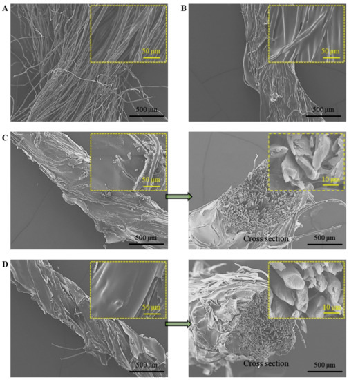 SEM images of gel/fibre composite actuators (insets show high-magnification images): (A) As-received multifilament cotton fibre; (B) PEPU coated untwisted fibre; (C) PEPU and alginate coated untwisted fibre; (D) gel/fibre twisted actuator (left side image showing surface morphology and right side image showing cross section of the twisted actuator).