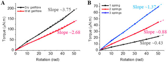 Torsional stiffnesses of the gel/fibre actuator and the return spring were evaluated from the torque-rotation curves (Figure 4). The torsional stiffness of the dry and wet gel/fibre actuator calculated from relevant torque-rotation curves was ~3.75 and ~2.68 µN.m/rad, respectively (Figure 4A). Relevant to hydrogel materials, stiffnesses of the conducting polymer actuators were smaller in the swollen state compared with the dry state [34]. The difference in stiffness of dry and wet (hydrogel) fibres represents the possible extent of moisture driven torsional actuation, with a greater difference triggering a higher actuation performance. As seen from Figure 4B, the torsional stiffness of the return spring became higher when the fibre diameter increased (related to the number of springs used). The torsional stiffnesses of 1, 2 and 3 springs were measured to be ~0.43, ~0.88 and ~2.68 µN.m/rad, respectively. These stiffnesses are much lower than that of the actuating gel/fibre, confirming that the opposing spring torque will not be above the threshold of blocking the actuator rotation.