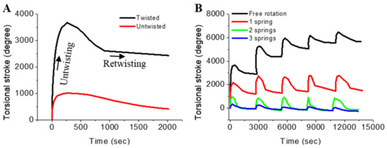 The initial data required for the theoretical prediction of torsional stroke against opposing torque were the stiffnesses of the actuating fibres and the return springs. The free torsional stroke was used as the basis, and the relevant stroke against return springs of certain stiffnesses was calculated by using Equation (3). As can be seen from Figure 6A, the magnitude of torsional stroke decreases almost linearly with gradually higher opposing torque from the return spring. This linear correlation of torsional stroke and opposing torque supports the development of scalable systems inspired by current investigative results. The predictive results show close agreement with the experimentally measured ones, indicating that the theoretical estimation based on torsion mechanics of return spring involved systems is a reasonable method for evaluating torsional stroke in twisted fibres. Insignificant discrepancies were found in lower opposing torque conditions that might be attributed to the inherent dynamic moment of inertia and stress relaxation phenomenon of core twisted structures. At higher opposing torque, appropriate balancing occurs between those inherent properties and the torque from spring, providing a highly reversible torsional actuator system.