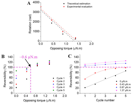 Graphical representation of the method to obtain high reversibility of torsional stroke: (A) agreement between theoretically estimated and experimentally measured results; (B) reversibility in terms of experimental opposing torque applied by the return spring; (C) number of cycles before achieving full reversibility.
