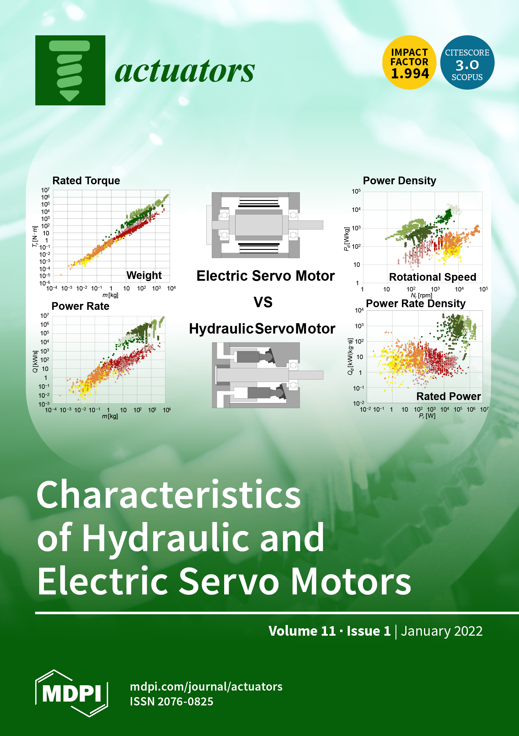 Cover Story: It is important to comprehensively evaluate which type of motor is most suitable when designing mechanical systems. This paper presents the results of a survey of the performance of electric and hydraulic servo motors which are commonly used in many mechanical systems and aims to provide quantitative data that can be used as a reference for selecting appropriate motors. We collected data on the characteristics of electric and hydraulic motors and compared and evaluated the characteristics of these servo motors using indexes such as torque, rotating speed, output power, power density, and power rate. View this paper