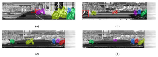 Some examples of the object recognition results are shown in Figure 21 and Figure 22. The masks with different highlight colors show recognized and segmented bikes. Though the bikes were placed in various locations and poses, most of them were identified, and the masks separated the bikes from the background with acceptable contours errors. There were still some failures for the hard cases, which are marked by red boxes in Figure 22a,b. The missing bike in Figure 22a is due to its small image occupancy, and in Figure 22b due to the lack of a large portion of the bike body in the image.