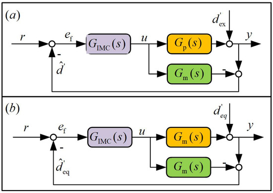 The structure of IMC is shown in Figure 2 (—actual controlled object; —nominal model of the controlled object; —internal model controller; —external disturbance; r—target signal; —estimated value of the disturbance; —estimated value of the equivalent disturbance; —error; u—control input; y—system output). The following can be derived from Figure 2a: