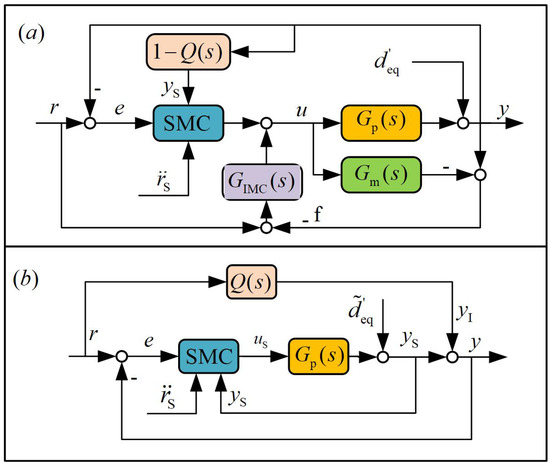 Based on the above decomposition, the controllers of the IMC subsystem and the SMC subsystem were designed respectively. In the controller design method proposed in this paper, the controller of the IMC subsystem was designed in the form of Formula (13) and the SMC subsystem controller was designed as the sliding mode controller. The control block diagram of the whole system is shown in Figure 3a and its equivalent structure is shown in Figure 3b. Next, the design details of the sliding mode controller are analyzed in combination with the block diagram.