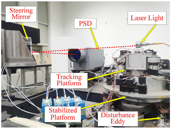 The electro-optical tracking device based on the FSM is usually a two-axis system. Because of the symmetry of the two axes, only one of them was used for analysis in the experiment. As shown in Figure 4, a device composed of two lapped systems was used to verify the controller designed in this paper. The upper platform was used to stabilize the laser light and the lower platform was used to simulate external disturbances. The stable platform was installed on the disturbance platform and the laser head was directly fixed on the top of the stabilized platform to simulate the moving target. Both platforms were driven by voice coil motors. On the disturbed platform, the eddy current sensors were used to measure the disturbance angle of the platform. The position response of the stabilized platform was directly obtained by the PSD. The employed control board in this system was PC104LX3073, on which the real-time operating system VxWorks was installed. In the experiment, the sampling rates of all the sample sensors were 5000 Hz and the operating frequency of the controller was set to 1000 Hz.