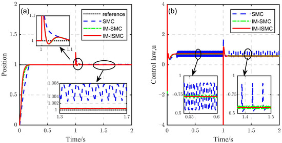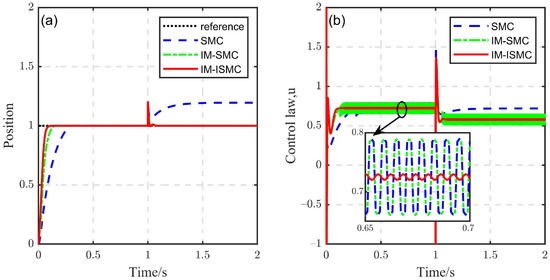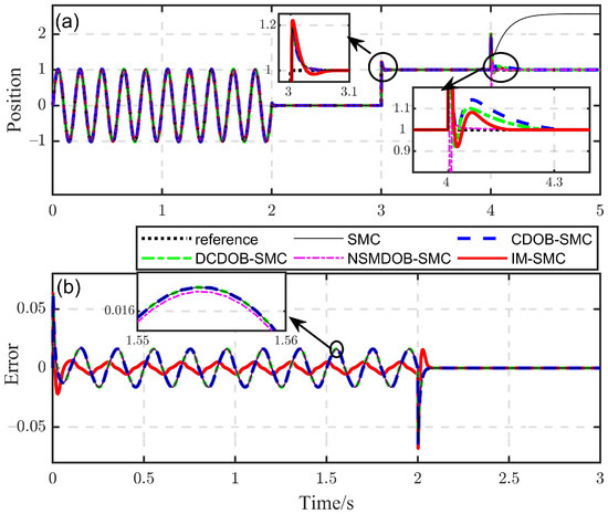 In Figure 6a, a sinusoidal input with a frequency () was given in the first two seconds, a step reference was given from the third second and a given external disturbance () was applied at the fourth second. The tracking error of the first three seconds is shown in Figure 6b. It can be seen that the control methods had a good ability to suppress disturbance except for the SMC method. Although the NSMDOB-SMC method took the shortest recovery time after disturbance, the initial fluctuation was the largest. Compared with the other three DOB-based methods, the IM-SMC method had better comprehensive performance. Compared with the SMC method, the DOB-based methods had little contribution to improving the steady-state tracking accuracy. The dynamic response of the IM-SMC was slightly worse than that of other methods, but the IM-SMC method obviously had a smaller sinusoidal tracking error.