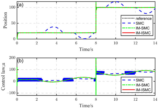 As mentioned in Section 1, the DOB cannot be used for tracking, but IMC can be used to track independently, so the IMC-based SMC was compensated by IMC with a part of the tracking amount; therefore, the tracking burden of the SMC was reduced and, consequently, the tracking error could be reduced. Next, the performance difference between the SMC based on the DOB and the SMC based on IMC was verified by comparative simulation. To show the superiority of the proposed algorithm, three different DOBs were designed and are presented in this subsection; they were: the conventional DOB (CDOB) [43], the dual-compensator DOB (DCDOB) [44] and the novel sliding mode DOB (NSMDOB) [7]. To ensure the relative fairness of the comparison, the SMC with the same parameters was invoked as the closed-loop controller. The related parameters are given in Table 1. The meaning of the parameters not explained in the table is consistent with the original reference. Therefore, the SMC, CDOB-based SMC (CDOB-SMC), DCDOB-based SMC (DCDOB-SMC), NSMDOB-based SMC (NSMDOB-SMC) and IMC-based SMC (IM-SMC) were used for comparison. The simulation verification was carried out via MATLAB/Simulink software. The simulation step size was set to 0.001 s and the solver was set to the Euler method. The simulation results are shown in Figure 6.