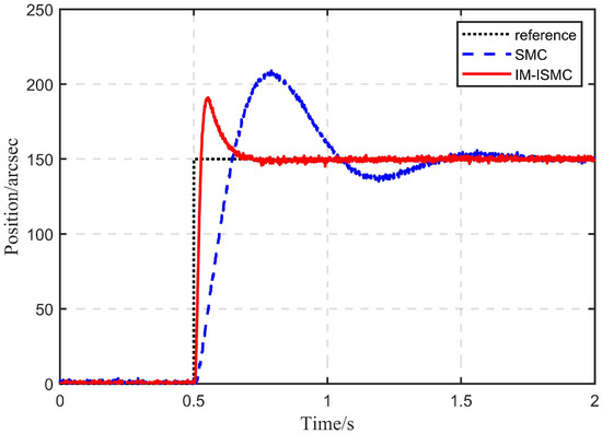 The tracking ability of the IM-ISMC structure proposed in this paper was verified without adding disturbance in this experiment. The tracking performance was measured by comparing the effect of tracking a given step signal and sinusoidal signals with different frequencies. In order to show the advantages of the IM-ISMC method, its results were compared with those of the SMC method. Firstly, for the given step signal, the tracking result is shown in Figure 10. It can be seen that the IM-ISMC method had better dynamic performance. Then, sinusoidal signals with different frequencies were considered and the FSM usually worked at Hz. Therefore, Figure 11a–c gives the tracking errors of sinusoidal signals with frequencies of 1 Hz, 2 Hz and 6 Hz and amplitudes of 500 arcsec. It can be seen that the tracking error obtained by the IM-ISMC method was obviously smaller than that obtained by the SMC method.