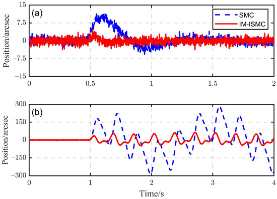 Figure 12a,b, respectively, shows the experimental results under step disturbance and compound sinusoidal disturbance. Because the disturbance was added by manual operation, the disturbance adding time in the two control methods (Figure 12a shows that disturbance was added at about 0.5 s, while Figure 12b shows that disturbance was added at about 1 s) was not exactly the same. The amplitude of step disturbance was 500 arcsec and the compound sinusoidal disturbance was composed of sinusoidal signals with amplitudes of 200, 100 and 50 arcsec and frequencies of 0.5 Hz, 3 Hz and 6 Hz, respectively. It can be seen that the IM-ISMC method had good disturbance rejection ability under the same switching gain. Increasing the switching gain of SMC allowed us to obtain better disturbance rejection performance, but, as shown in the simulation results (Figure 8), an excessive switching gain caused large amplitude chattering and increase in the load on the driver, which is adverse to the actual operation. At the same time, we should pay attention to the SMC result of Figure 12a. In this case, the value was less than the upper bound of the disturbance. Theoretically, the disturbance suppression ability of the SMC is very weak. The result in the figure was caused by the attenuation effect of the stabilized platform itself on the disturbance.