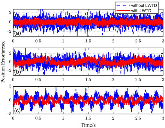 To verify the feasibility and the practical application effect of the LWTD, the tracking results obtained by using the IM-ISMC control structure were compared before and after adding the LWTD. In the experiment, the Haar wavelet was used for the wavelet transform, the general threshold function and the soft threshold method were used to calculate the threshold value and process wavelet coefficients, respectively, and data symmetric continuation was used to weaken the boundary distortion caused by the wavelet transform. In addition, the length of the sliding window was set to 16 and the number of decomposition layers was set to 3. The experimental results are shown in Figure 13. Figure 13a–c shows the tracking errors of sinusoidal signals with frequencies of 0 Hz, 1 Hz and 5 Hz and the amplitude of 100 arcsec, respectively. It can be seen that the tracking error could be significantly reduced by adding the LWTD, that is, using the output signal after LWTD, as the feedback could effectively reduce the tracking error, which proves that the LWTD had a good de-noising effect and could effectively recover the actual useful signal from the noise. Besides, through experiments, we also verified that the LWTD could be used in the control system.