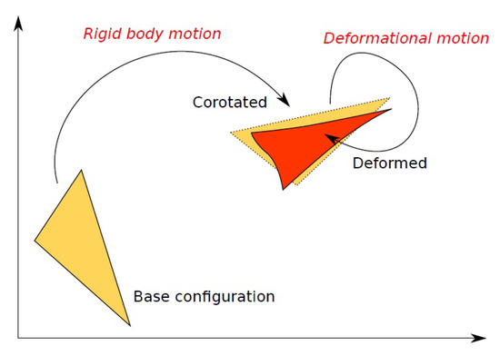 Figure 2). Starting from a base configuration that represents the origin of displacements, the final configuration is decomposed into a corotated configuration given by a rigid body motion of the base configuration and a deformed configuration where element deformations are obtained concerning the corotated configuration. Assuming that only small deformations occur between the corotated and deformed configuration, the CR approach allows using a linear formulation to compute the internal forces. Under this assumption, it is possible to represent stiffness by using a symmetric matrix