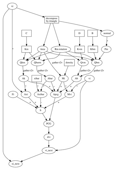 Figure 3 shows the dependency graph in the computation. For each triangle, the area, the surface normal, and its rotation matrix are calculated. The stiffness matrices (