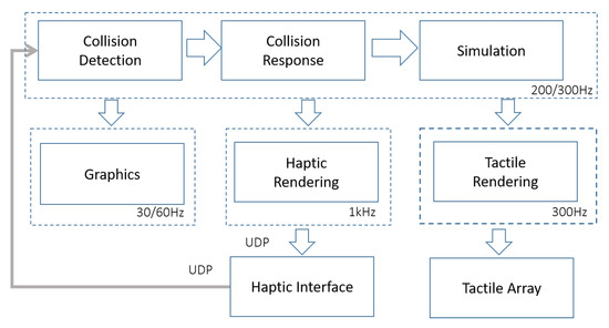 The solutions presented in the literature are usually conceived for usage in a graphical simulation; thus, they need an update rate of just 30–60 Hz to generate a smooth visual transition. All recent advancements focus on realism but are not tailored for haptic interaction or high update rates. Indeed, whenever the main goal is to develop a simulation that involves a haptic interactive system, it is a rule of thumb to adopt a feedback rate above 1 kHz to maintain good stability properties of the system for rigid body contact. For a collision with a deformable surface, this requirement can be lowered, continuing to yield good stability issues and correct perception of touch but still needing an update rate of an order of magnitude greater than the one used in graphical simulations. The finite element implementation, even being computationally expensive, can be accelerated using an implicit numerical integration method to solve the well-known partial differential equation
