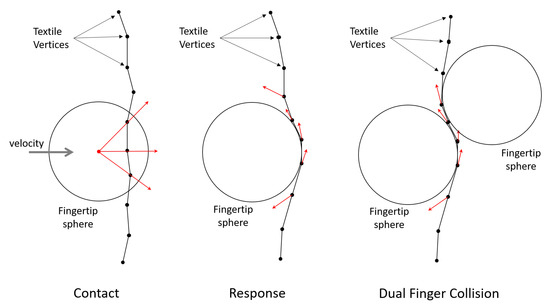 The collision check between the cloth and the operator’s fingertips is evaluated by computing the distance between implicit sphere surfaces and textile vertices. An alternative option could be the one of checking the collisions between the spheres and each triangle composing the textile. However, the computational cost of this operation is larger and would require propagating the forces exerted on a specific point of the triangle surface back to the triangle vertices. Given the dimension of the sphere radius (fingertip width) compared to the distance between nodes in the simulated textile (dimension of the triangles), the per vertex collision check is a sufficient approximation that gives a boost to the computational complexity of the algorithm. The cost of this operation is linear to the number of vertices.