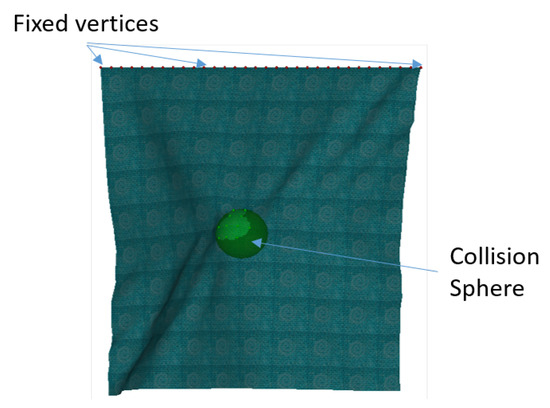 14], the formulation of a linearized stiffness matrix directly characterized by physical elastic parameters taken from Kawabata measurements can be found. In particular, in this implementation, the behavior of the simulated fabric takes into account membrane, bend, and viscosity forces.