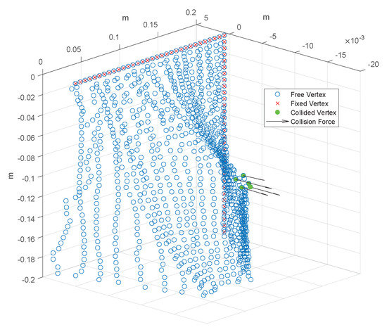 18] because it is easy to implement and fast to simulations. However, it is not suitable for complex elastic effects, and, therefore, increasing the mesh resolution, the quality of the fidelity decreases. In addition, since the model does not have any physical meaning related to the parameters, it needs a huge tuning effort to obtain the desired performance. PBD models materials as discrete particles without meshes. The simulation is based on an implicit integration deriving the internal forces from holonomic constraints. The peculiarity of such an approach is that it assigns a stiffness level