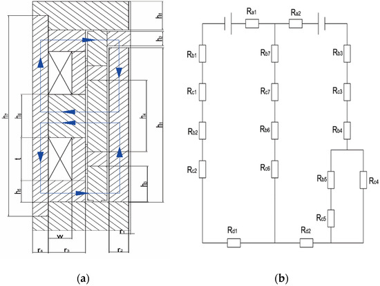 Magnetic circuit of annular multi-channel MR valve: (a) magnetic circuit diagram and (b) equivalent magnetic circuit diagram.