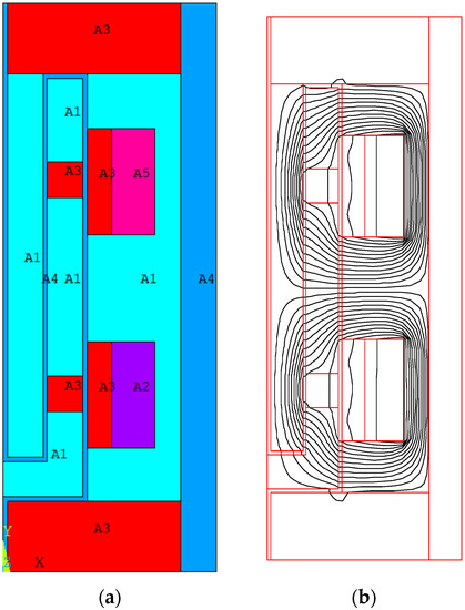 The physical environment of the magnetic fluid seal is created in the preprocessor of ANSYS finite element analysis software. Due to the symmetry of the structure, the three-dimensional axisymmetric problem of the MR valve can be simplified to a two-dimensional plane problem. The magnetic conductivity material of the annular multi-channel MR valve structure is 45 steel, shown in area A1 of Figure 6a; the magnetic insulation material is stainless steel, shown in area A3 of Figure 6a; the coil is shown in area A2, A5 of Figure 6a, and the gap is shown in area A4 of Figure 6a. Oil-based MRF with saturation magnetization of 295 KA/m is adopted. Since the magnetic force generated by the energized coil is greater than the saturation magnetization of MRF within the damping gap, MRF is saturated magnetized, and the saturation magnetization of MRF is almost the same as that of air, so the magnetic fluid can be treated like air. Corresponding material attributes are assigned to each part, intelligent grid division is selected, and the precision of the grid is level 1. The boundary condition of parallel magnetic force lines is applied to the model boundary. When a current of 1A is applied to the excitation coil, the electromagnetic field simulation results are shown in Figure 6b.