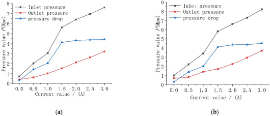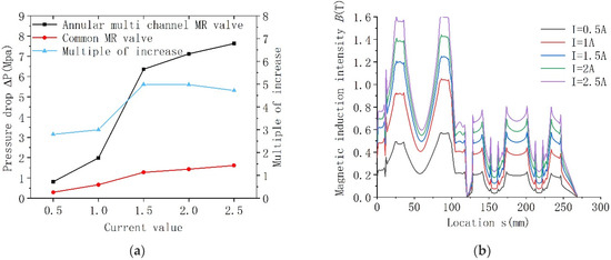 (a) Influence of current size on magnetic flux density of the valve; (b) influence of current size on valve pressure drop performance.