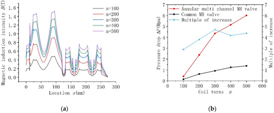 (a) Influence of coil turns on magnetic flux density of valve; (b) influence of coil turns on valve pressure drop performance.