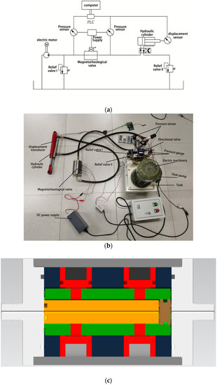 (a) Schematic diagram of the experimental system; (b) test rig picture; (c) three-dimensional assembly drawing of annular multi-channel MR valve.