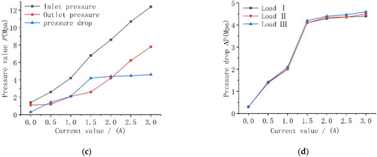 Figure 12a–c shows the pressure drop performance of the annular multi-channel MR valve changing with current under the same load. Relief valve II is used to simulate different external loads and then observe the inlet pressure, outlet pressure and pressure drop performance under different current levels to judge whether the pressure drop performance of the ring-shaped multi-channel magnetorheological valve is stable. It can be seen from Figure 12a–c that when the load is the same, the inlet pressure and outlet pressure increase with the increase of current, while the pressure drop increases first and then stays constant with the increase of the current. This is because the current increases, the annular multi-channel MR valve internal consumption increases, and then, the inlet and outlet pressures increase. The pressure drop reaches saturation when the current is 1.5 A and the inlet and outlet pressure difference reaches 4.2 MPa. With the gradual increase of current (0–1.5 A range), based on the respective load, the outlet pressure keeps stable; the inlet pressure and the inlet and outlet pressure difference both increase with the increase of current value, so the annular multi-channel MR valve has excellent differential pressure performance and wide adjustable range. Figure 12d shows the influence of different loads on the performance of the annular multi-channel MR valve. The three curves overlap, so it can be considered that the load has little influence on the regulating range of pressure drop and pressure drop performance, and the pressure drop performance of the annular multi-channel MR valve is stable.