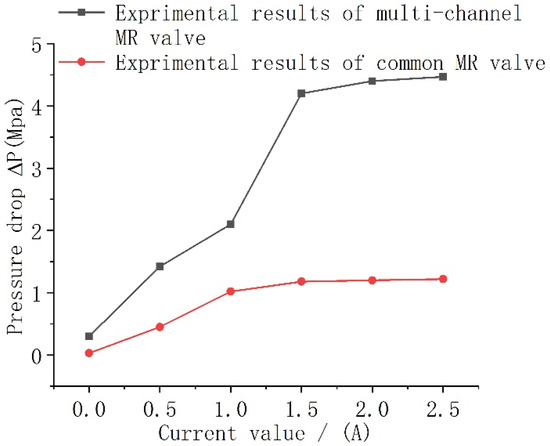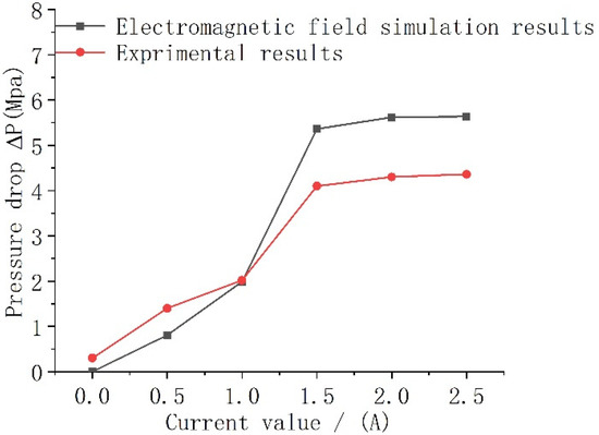 In order to verify the reliability of the structural design of the annular multi-channel MR valve and the accuracy of electromagnetic field simulation, this section verifies the comparison of the electromagnetic field analysis results and experimental results of the annular multi-channel MR valve under different current sizes. The correctness of the simulation results proves that of the electromagnetic field, the mesh and the result of the experiment.